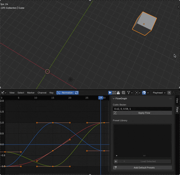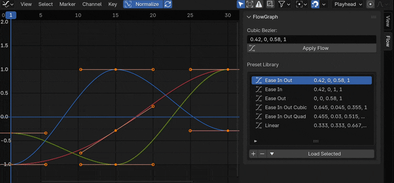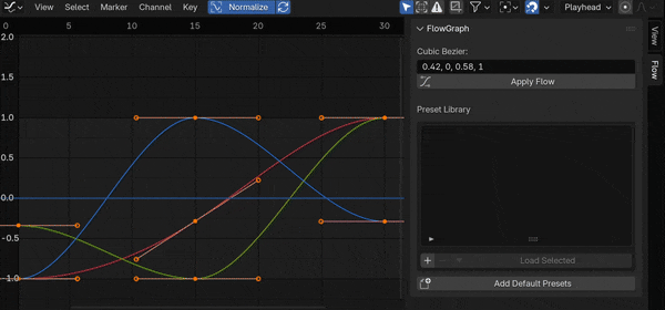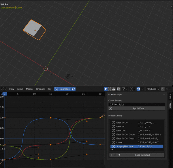This is a very basic Blender add on to change the easing curve between two adjacent keyframes based on cubic-bezier values. Select two keyframes, paste the cubic bezier values and click apply. It was design with the AfterEffects plugin Flow, trying to very vaguely imitate it's functionality and features, but with Blender's or more specifically pythons limitations.